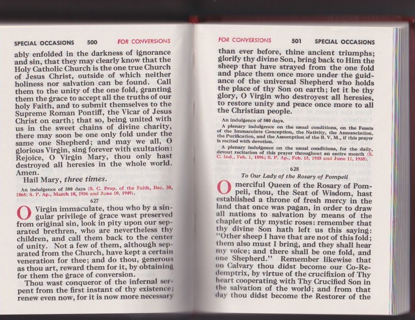 Back in the day, when the Catholic Church professed it was the One True Holy Roman Catholic and Apostolic Church established by Jesus, us Catholics prayed indulgenced prayers for conversions that were published in The Raccolta.